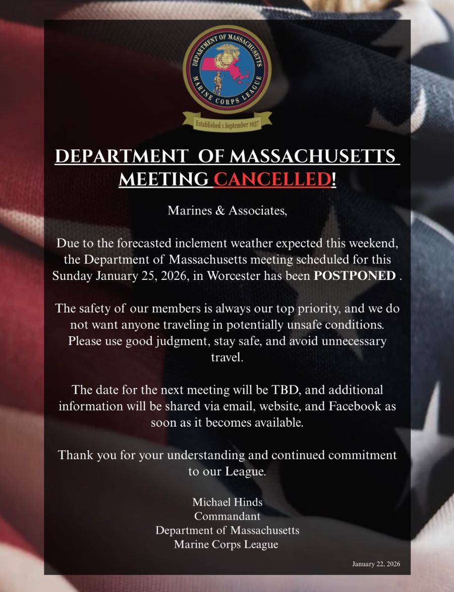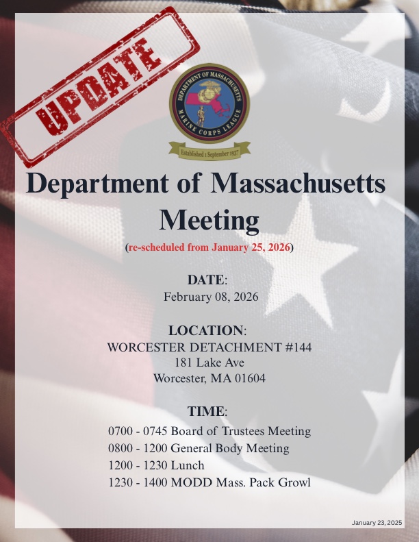 As the newly elected Commandant of the Department of Massachusetts Marine Corps League, my mission is to lead with integrity, unity, and purpose. I am committed to strengthening our Detachments, honoring the legacy of our Marine Corps, and advancing the core values of Honor, Courage, and Commitment across the Commonwealth for all veterans and patriots.